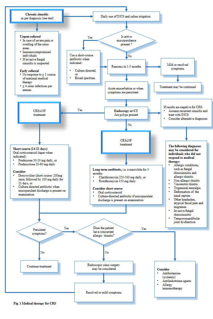 Chronic rhinosinusitis (CRS) has a substantial effect on the patient’s quality of life. It has recently been accepted that CRS has multiple distinct components, e.g. infection and inflammation, which has led to changes in the therapeutic approach. In addition, it is no longer considered practical to manage CRS as a prolonged version of acute rhinosinusitis. A CRS diagnosis is based on the type and duration of symptoms, together with an objective finding of inflammation of the nasal mucosa or paranasal sinuses. differences in treatment are based on the presence or absence of nasal polyps.